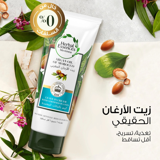 كريم يُترك على الشعر بزيت الأرغان المغربي والنباتات المعتمدة- من هيربال: تؤمن هيربل إسنسز بفعالية المكونات المُستخلصة من الطبيعة. لذلك، تحتوي منتجاتنا كلها على نباتات حقيقية تغمر شعرك برائحة جميلة وتجعل ملمسه حريريًا.