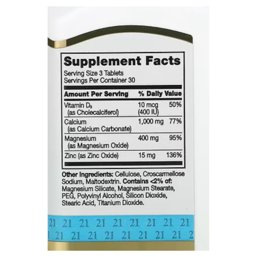 مكمل الكالسيوم والمغنيسيوم والزنك + د3، 90 قرص- من سينتري 21: ثلاثي معادن مهمة + فيتامين د3 لدعم صحة العظام مكمل معدني خالٍ من الجلوتين مختبر معمليًا بجودة مضمونة يدعم ثلاثي المعادن المكون من الكالسيوم والمغنيسيوم والزنك بالإضافة إلى فيتامين د 3 العظام والعضلات وجهاز المناعة.