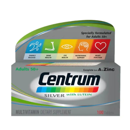 سنترم فضي فيتامينات متعددة مع لوتين 100 قرص: ركيبة خاصة عالية الجودة من العناصر الغذائية الدقيقة للرجال والنساء فوق سن الخمسين