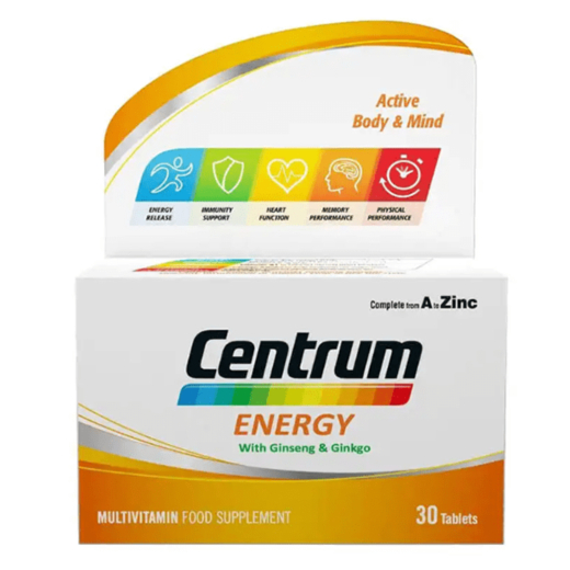 سنتروم فيتامينات متعددة انيرجي مع الجينسينج والجنكو 30 قرص: فيتامينات تدعم الصحة العامة بمستخلصات الجينسينج والجنكو بيلوبا.