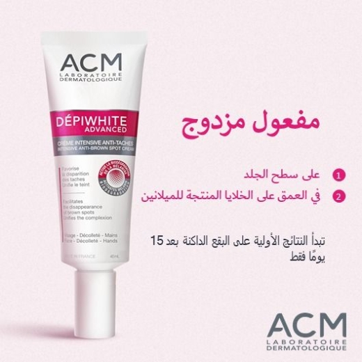 بفضل توليفة من المواد الفعالة المحددة ، يخفف Depiwhite Advanced أو يزيل البقع البنية ، ويحد من ظهورها مرة أخرى ويوحد البشرة من خلال تنظيم إنتاج الميلانين الذي يتكون من البقع البنية بفضل 3 إجراءات تآزرية: