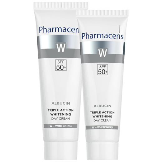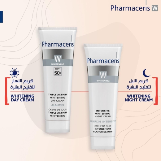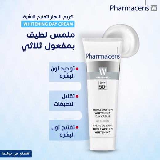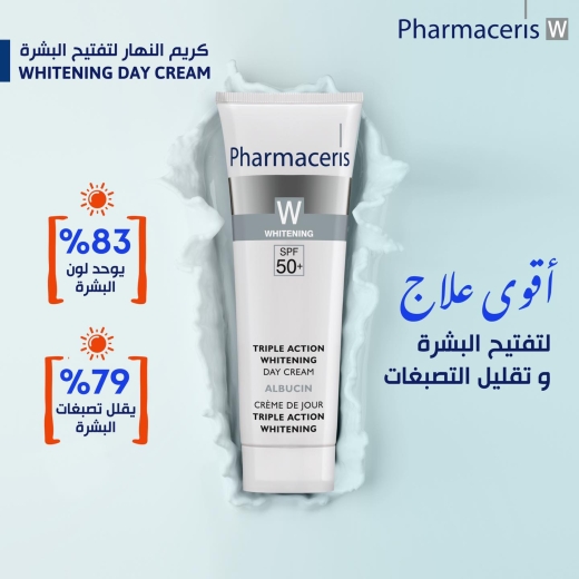 كريم نهاري مفتح بمفعول ثلاثي + 50% حماية من اشعة الشمس - من فارماسيريز: موصى به للعناية اليومية بالبشرة التي تعاني من فرط التصبغ ، أو تفاوت اللون ، أو الجلد المعرض لخطر تغير اللون بسبب التعرض لأشعة الشمس ، والتغيرات الهرمونية ، ووسائل منع الحمل الفموية ، والحمل ، والعلاجات الجلدية ، والعمليات الجراحية التجميلية أو الالتهابات