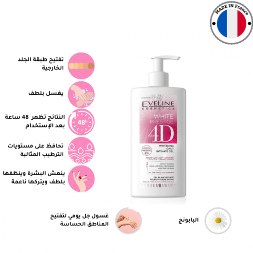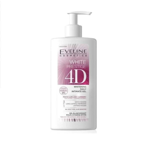 غسول نسائي يومي لتفتيح المناطق الحساسة وايت برستيج 4 دي -من ايفلين: غسول يومي نسائي للمنطقة الحساسة مصمم بتقنية FRACTO ILLUMI LASER المتطورة مع مركب لوموايت الذي يعمل على كسر الميلانين المتراكم في المنطقة مما يساعد على تفتيحها.