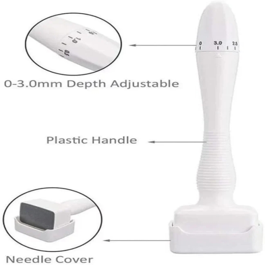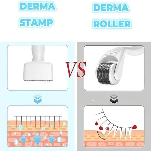 لها نفس فوائد الديرما رولر لكن بكفاءة أكبر وعملية اكثر لأنها اداة تحمل مقاسات متعددة تبدأ من مقاس ربع ملم إلى ٣ ملم من خلال التحكم بها يدويا حيث انها تغنيك عن شراء مجموعة من الديرما رولر التي كل جهاز منها يحمل مقاس واحد فقط وهذه كانت إحدى عيوب جهاز الديرما رولر ممايضطرك إلى شراء مجموعة كبيرة منها لان من المعروف ان كل منطقة في الوجه او الجسم لها مقاس ابرة معينة سنتحدث عنها لاحقاً جاءت ديرما ستامب لتحل هذه المشكلة بأنها عبارة عن جهاز واحد فيه جميع المقاسات يمكن التحكم به يدويا ( تقصير وتطويل الإبرة)