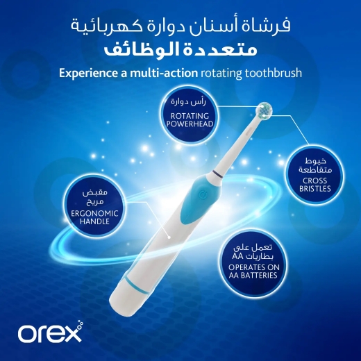 فرشة اسنان كهربائية راس يدور + راس أضافي بطارية قابلة للتغير - من أوركس: تنظّف هذه الفرشاة كل زاوية من فمك بعمق، حتى المناطق التي يصعب الوصول إليها.