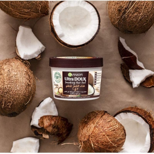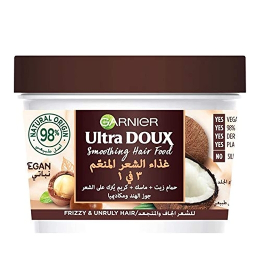 غذاء الشعر المنعم الترا دو 3 في 1 بجوز الهند للشعر المجعد- من غارنييه: علاج تنعيم 3 في 1 للشعر الجاف والمتطاير بتركيبة غنية بجوز الهند والمكاديميا المنعمة.