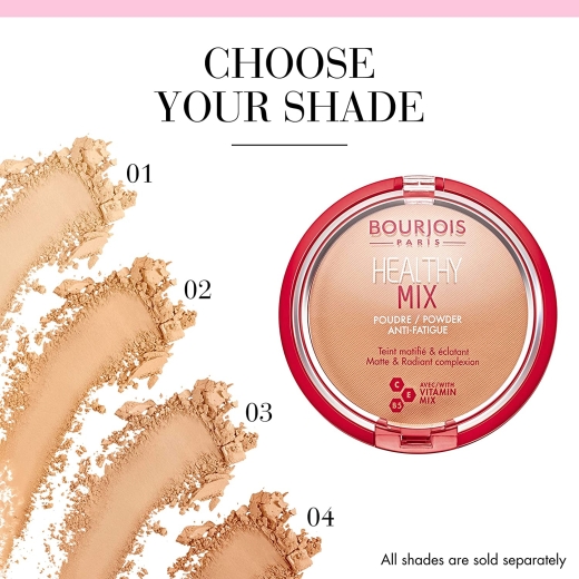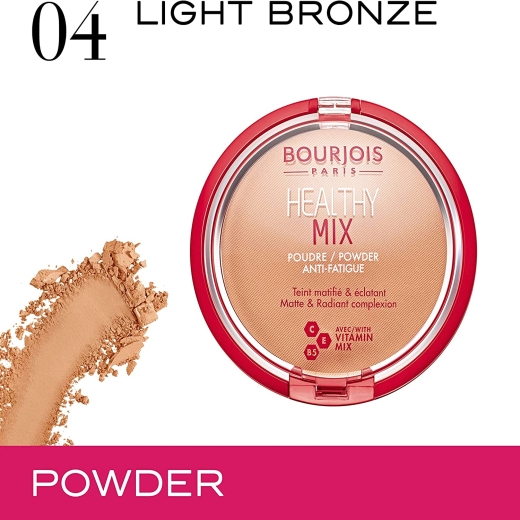 بودرة الوجه هيلثي مكس درجة "لايت برونز" رقم 4 - من برجوا: بودرة الوجه من بورجوا بتركيبة ناعمة وغير لامعة توحد لون البشرة. معززة بفيتامينات اي و سي و بي 5 التي تمنحك مظهر بشرة نظرة وصحية. استخدميه بالفرشاة او بالإسفنجة لتحصلي على تغطية ممتازة وبشرة خالية من العيوب.