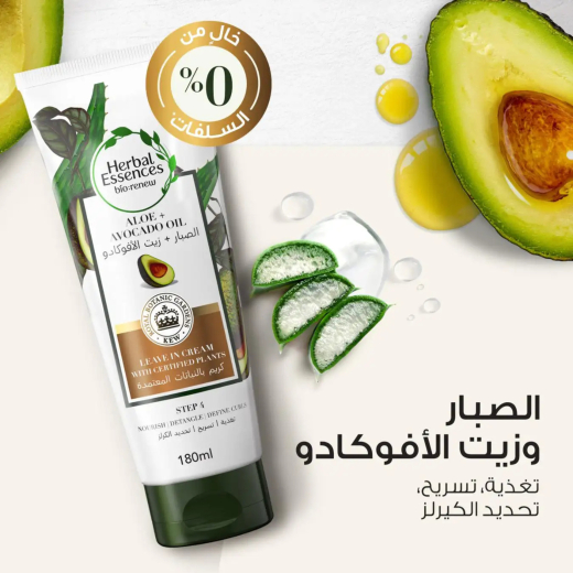 كريم يُترك على الشعر بخلاصة الصبار وزيت الأفوكادو- من هيربال: تؤمن هيربل إسنسز بفعالية المكونات المُستخلصة من الطبيعة. لذلك، تحتوي منتجاتنا كلها على نباتات حقيقية تغمر شعرك برائحة جميلة وتجعل ملمسه حريريًا.