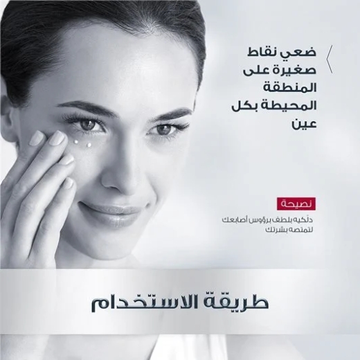 ضعي كمية بحجم حبة البازلاء تحت عينيك وحولها. دلكي البشرة بلطف بأطراف أصابعك، مع الحرص على تجنب ملامسة عينيك مباشرةً.
