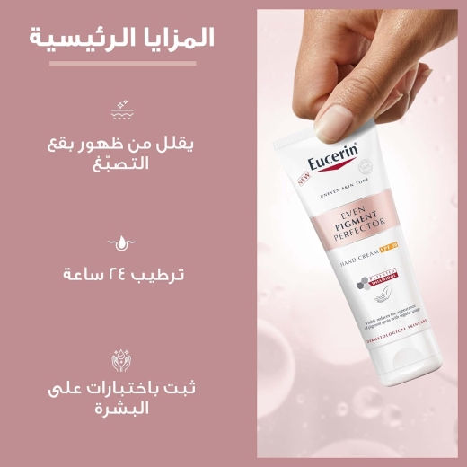 كريم اليدين ايفين بيجمنت بيرفيكتور بعامل وقاية من اشعة الشمس30%- من يوسرين: يحتوي كريم اليدين المقاوم للتصبغ من يوسيرن على الثياميدول، وهو عبارة عن مكون فعال وحاصل على براءة اختراع يعمل على السبب الجذري وفرط التصبغ عن طريق تقليل إنتاج الميلانين. تم اختباره سريرياً من جانب أطباء الجلدية لتقليل البقع الداكنة ومنع إعادة ظهورها. تظهر النتائج الأولية بعد أسبوعين وتتحسن النتائج بشكل مستمر مع الاستخدام المنتظم. مع فلاتر الأشعة فوق البنفسجية فئة A وB (عامل الوقاية من أشعة الشمس 30)، يوفر كريم اليد المصحح حماية فعالة من أشعة الشمس ويقلل من فرص ظهور بقع تصبغ ناتجة عن الشمس. تقل البقع الصبغية على اليدين بشكل واضح وتبدو البشرة متجانسة ومشرقة.