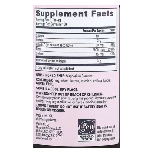 كولاجين فائق الجودة + فيتامين سي وبيوتين، 180 قرص - من نيوسيل: يدعم صحة الشعر - البشرة - الأظافر - المفاصل