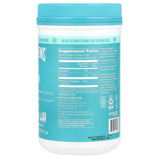 يساعد منتجنا من الكولاجين البحري المناسب للنباتيين الذين يأكلون السمك، الذي تم الحصول عليه من سمك القد الذي تم صيده من البرية، في دعم صحة البشرة، والشعر، والأظافر، والعظام، والمفاصل.∧ ما عليك سوى إضافته إلى مشروبك أو وصفتك المفضلة والاستمتاع بفوائده!