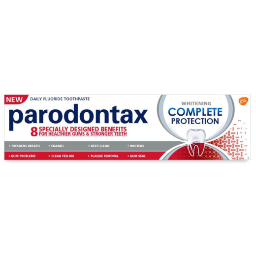 معجون أسنان حماية متكاملة للتبييض 75 مل - من بارودونتكس: يساعد معجون بارودونتكس حماية متكاملة للتبييض على الحفاظ على صحة اللثة وقوة الأسنان مع 8 فوائد مصممة خصيصًا تتضمن المساعدة في استعادة الأسنان لبياضها الطبيعي عن طريق إزالة البقع الموجودة على سطح الأسنان بلطف.