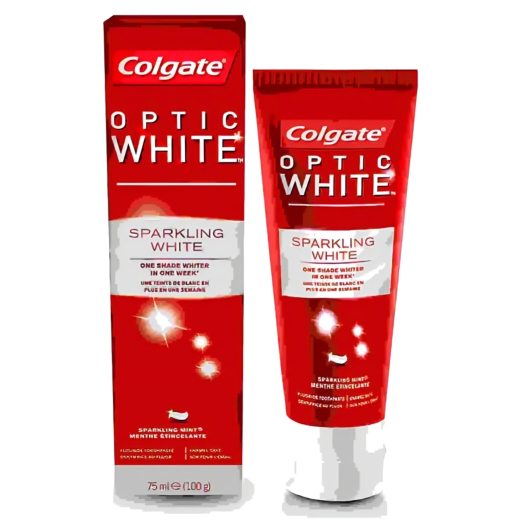 معجون الاسنان اوبتيك وايت اللامع -من كولجيت،: تحتوي جسيمات دقيقة شديدة الفعالية على مكونات مشابهة لتلك التي يستخدمها أطباء الأسنان. يساعد كولجيت اوبتيك وايت على إزالة البقع ومنع تراكم الجير للحصول على أسنان أكثر بياضًا في أسبوع واحد. سيساعد الاستخدام المستمر لكولجيت اوبتيك وايت على إبقائها أكثر بياضًا لفترة أطول.
