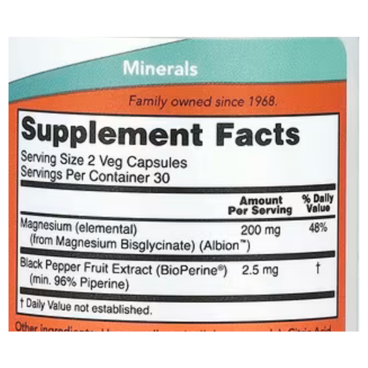 تستخدم جليسينات المغنيسيوم المغنيسيوم المرتبط بالحمض الأميني الجلايسين، مما يسهل الامتصاص المعوي. يُعد المغنيسيوم معدنًا مهمًا لإنتاج الطاقة وعملية الأيض، وانقباض العضلات، وإرسال النبضات العصبية، وتمعدن العظام. وهو عامل مساعد مطلوب لما يقدر بـ 300 إنزيم. من بين العمليات التي تتطلب المغنيسيوم إنتاج الدهون والبروتين، وكذلك أيض الجلوكوز. تعتبر حالة المغنيسيوم مهمة أيضًا لتنظيم توازن الكالسيوم من خلال تأثيره على الغدة الجار درقية. هذا المنتج معزز بـ BioPerine® وهو خلاصة الفلفل الأسود الخاضع لحقوق الملكية.