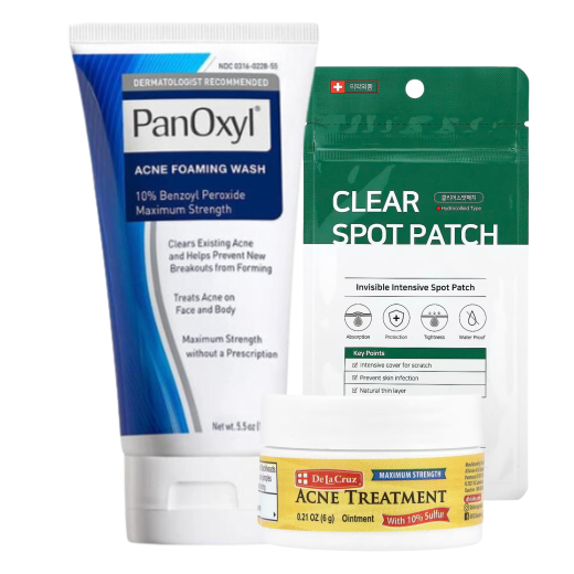 مجموعة علاج حب الشباب غسول 10% بانوكسيل + كريم حب الشباب + لصقات حب الشباب: غسول رغوي لحب الشباب من مادة البنزويل بيروكسايد 10%- من بانوكسيل: