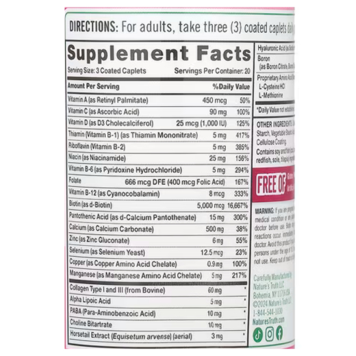 مكمل تقوية الشعر والبشرة والأظافر بالبيوتين، 60 قرص- من ناتشرز تروث: أطلقي العنان لجمالك الداخلي مع هذه الأقراص المغلفة للشعر والبشرة والأظافر. توفر كل جرعة/ حصة مجموعة من الفيتامينات والمعادن المفيدة، بما في ذلك 5,000 مكجم من البيوتين، بالإضافة إلى فيتامين جـ، وفيتامين هـ، وأكثر من ذلك. توفر هذه الأقراص المغلفة أيضًا دعمًا إضافيًا من الكولاجين وحمض الهيالورونيك والأحماض الأمينية.