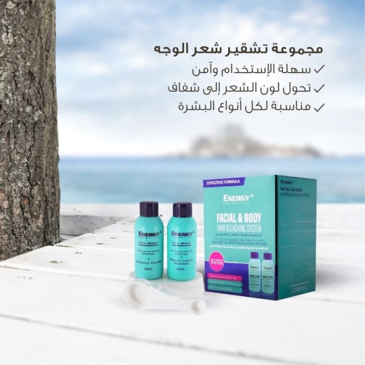 مشقر كريم تشقير الوجه والجسم - من انرجي: لتشقير شعر الوجه والجسم تركيبة لطيفة وفعالة تعمل على تفتيح الشعر الداكن الزائد على الوجه والجسم بسرعة وفعالية مع إضفاء الإنصاف على البشرة. يضفي نضارة طويلة الأمد ويغذي البشرة ويتركها ناعمة مع ملمس حريري. يوصى به حتى على البشرة الأكثر حساسية.