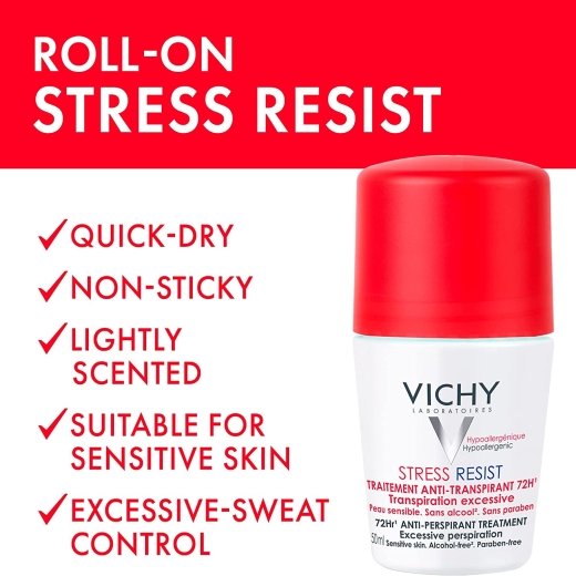 مزيل عرق يدوم لمدة 72 ساعه ابيض - غطاء احمر - من فيشي: مزيل العرق فعال للغاية للرجال والنساء الذين يعانون من التعرق المفرط، يتميز بتركيبة غير لزجة وسريعة الجفاف تحتوي على بيرسبيكالكام سي الذي يتحكم في تدفق الحرارة إلى الإبطين خلال فترات الإجهاد ممزوج بملح الألومنيوم لتنظيم التعرق وهو غني بالبرلايت، وهو معدن فائق الامتصاص حاصل على براءة اختراع يمتص الرطوبة الزائدة، يوفر راحة وحماية مثالية لمدة تصل إلى 72 ساعة، يترك البشرة هادئة ومريحة مختبرة على البشرة الحساسة بنسبة 100% وخالية من الكحول. خالٍ من البارابين