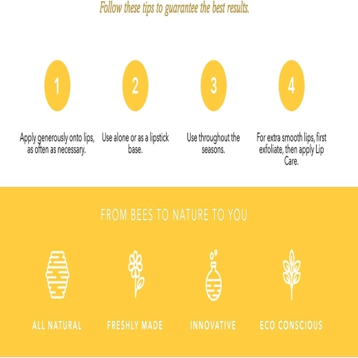 مرطب شفاه بالعسل الطبيعي -من بيزلين: يعتبر مستحضر العناية بالشفاه الخالٍ من النكهة بمثابة العلاج المثالي للشفاه الجافة والمتشققة. يلطف الشفاه الحساسة، ويرطبها، ويجددها بفضل احتوائه على شمع العسل الطبيعي والزيوت الثمينة مع حمايتها من المهيجات الخارجية. سيرا ألبا (شمع العسل). زيت برونوس أميغدالوس دولسيس (اللوز الحلو). زيت جنين القمح، من شركة تريتكوم فولجير شمع كوبرنيشيا سيريفيرا (الكرنوبا). مستخلص الجزر من دوكوس كاروتا ساتيفا. زيت بذور نيجيلا ساتيفا. أسيتات التوكوفيرول (فيتامين E).