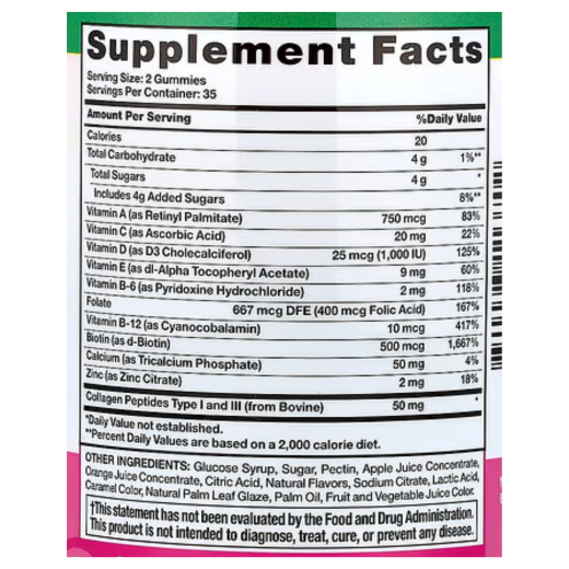 محتوى الكولاجين: تضيف 50 ملغ من كولاجين النوعين الأول والثالث (من مصدر بقري)، مما يدعم صحة البشرة والشعر والأظافر.