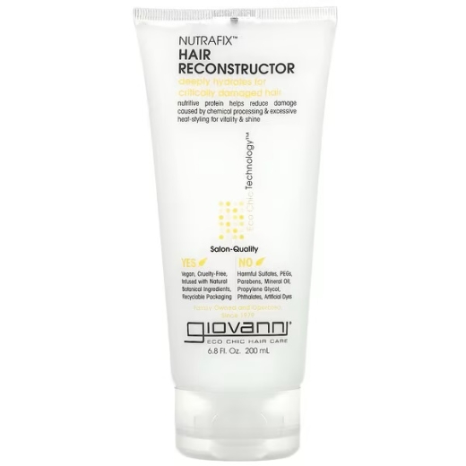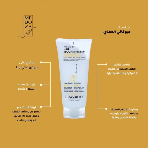 معالج الشعر التالف - من ماركة جيوفاني: تعانين من تلف الشعر... أليس كذلك؟ يحتاج الشعر بعد المعالجة المفرطة إلى حمايته بدءًا من الجذور. وهذا المنتج المخصص لإعادة بناء الشعر وعلاجه من الجذور يعمل على علاج الضرر الناتج عن المواد الكيميائية والاستخدام المفرط لأجهزة التصفيف الحرارية حيث يصبح الشعر هشًا وخشنًا وضعيفًا وباهتًا. ويساعد Nutrafix™ في حل مشاكل الشعر عن طريق غرس البروتين في الخصلات التي تكون في أمسّ الحاجة إليه. استخدمي هذا المنتج ضمن ما تستخدمينه من وسائل لتصفيف الشعر وذلك للمساعدة في تقليل الضرر.