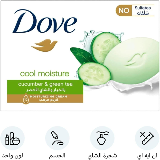 صابونه بالخيار و الشاي الاخضر كبير - من دوف: "نعلم جميعنا بمنافع الشاي الأخضر وبمزايا الخيار المنعشة، فلماذا لا ندع بشرتنا تعيش التجربة عينها؟ يجمع قالب كريم الجمال ملمس منعش من مجموعة الانتعاش من دوڤ بين رائحة الخيار والشاي الأخضر المنعشتين، ومكونات لطيفة، و¼ كريم مرطب لكي تستمتعي بمظهر بشرتك الصحي وبملمسها الناعم. أفضل طريقة تبدأين بها يومك هي باستعمال هذا القالب عند الاستحمام. وفي حال أردت الشعور ببشرة منتعشة ومرطّبة في الوجه واليدين، فما رأيك بإضافة قالب كريم الجمال ملمس منعش من مجموعة الانتعاش من دوڤ إلى روتين تنظيف بشرتك. "