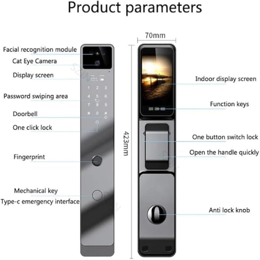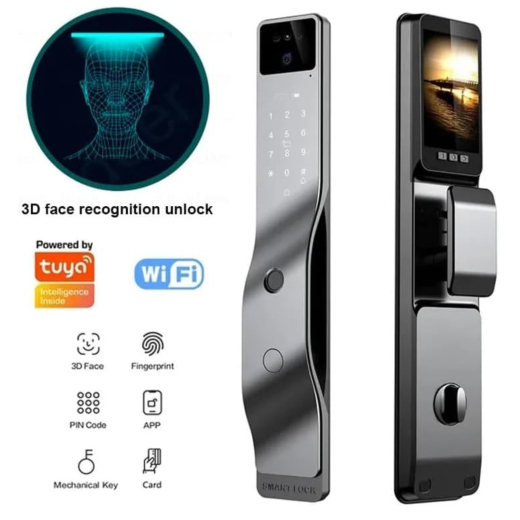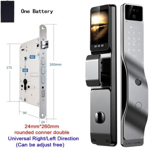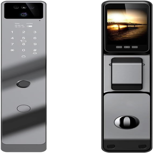كاميرا مدمجة: قد تشمل القفل كاميرا مدمجة لمراقبة من يقترب من الباب، مما يضيف طبقة إضافية من الأمان.