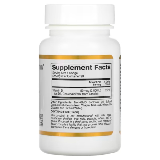 يحتوي فيتامين د3 من California Gold Nutrition على الكوليكالسيفيرول من اللانولين في شكل كبسولات هلامية جيلاتينية سمكية. تركيبة مُعدة بدون جلوتين أو مكونات معدلة وراثيًا أو صويا.