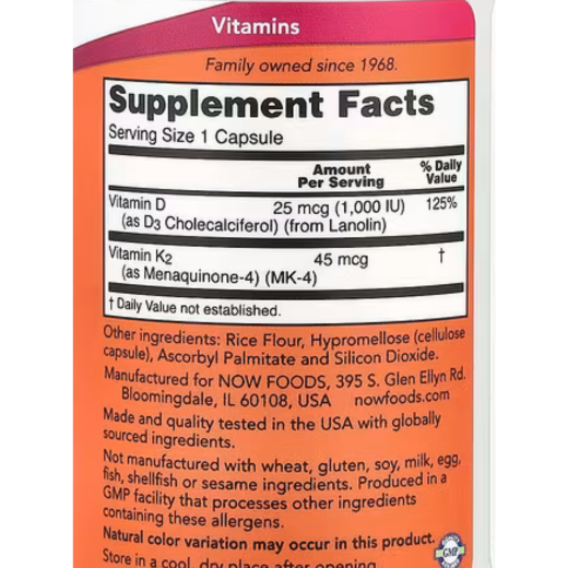 يجمع NOW بين عنصرين مغذيين تم بحثهما على نطاق واسع لدورهما في صحة العظام والأسنان ونظام القلب والأوعية الدموية. يعزز فيتامين د 3 نقل الكالسيوم وامتصاصه. تشير الدراسات الحديثة إلى أن فيتامين د 3 قد يلعب دورًا في عمل الأنسولين بشكل سليم وأيض الجلوكوز وله وظيفة مهمة داخل جهاز المناعة. فيتامين ك ضروري لتكوين مصفوفة عظام صحية وقوية. يتمحور دور فيتامين ك في دعم صحة الشرايين حول قدرته على دعم عملية الأيض المناسبة للكالسيوم في بنية الأوعية الدموية. فيتامين ك 2 هو شكل نشط ومتوفر حيويًا من فيتامين ك.