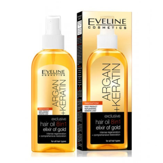 زيت الشعر الارجان والكيراتين 8 في 1 اكسير الذهب- من ايفلين: يحتوي على كيراتين يرمم الشعر التالف ويحميه من التقصف يزيد لمعان الشعر ويجعله أكثر صحة وحيوية يغذي الشعر من الجذور حتى الأطراف