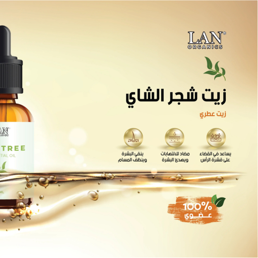 زيت شجرة الشاي الأساسي 30 مل- لان اورجانيك: زيت شجرة الشاي الأساسي هو زيت طبيعي نقي 100%، مُستخلص بعناية من أوراق شجرة الشاي ذات الفوائد العلاجية المذهلة. يُعرف هذا الزيت بخصائصه المضادة للبكتيريا والفطرية، مما يجعله الخيار الأمثل لعلاج مشاكل البشرة مثل حب الشباب والالتهابات، وأيضًا للعناية بفروة الرأس والقضاء على القشرة. بفضل تركيبته الفريدة، يوفر الزيت حماية طبيعية ويعمل على تنقية البشرة والشعر من الشوائب.