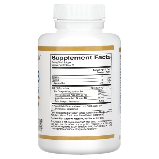 زيت السمك الممتاز أوميجا 3 2000 ملجم 100 كبسولة هلامية - من كاليفورنيا غولد نيوتريشن: أحماض أوميغا-3 الدهنية أحد أنواع "الدهون الجيدة" الموجودة في العديد من المصادر السمكية التي يستخدمها جسمك في دعم مختلف الوظائف. يحتوي زيت السمك الممتاز الذي يحتوي على أوميجا-3 من California Gold Nutrition على العديد من أحماض أوميجا-3، بما في ذلك حمض الدوكوزاهيكسنويك وحمض الإيكوزا بنتانويك، التي يمكن أن تساعدك في الحصول على وفرة من هذه المغذيات يوميًا، لتعزيز صحة العديد من الأنظمة في الجسم.*